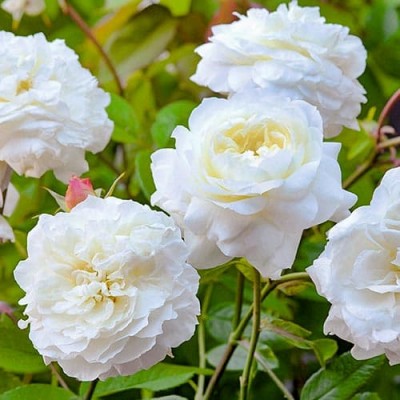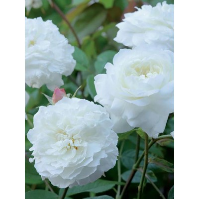 Очаровательные крупные розы с густомахровой чашечкой во время цветения наполняют воздух нежным сладким ароматом, который чарует нотками горького миндаля и терпкого мёда. Цветение продолжается практически непрерывно. Цветы имеют белую окраску, иногда с лёгкой розовой поволокой, и выглядят слегка растрепанными и пышными.